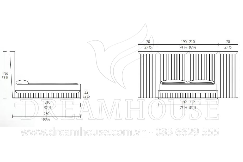 - Đầu giường: ván ép, phủ bọt polyurethane