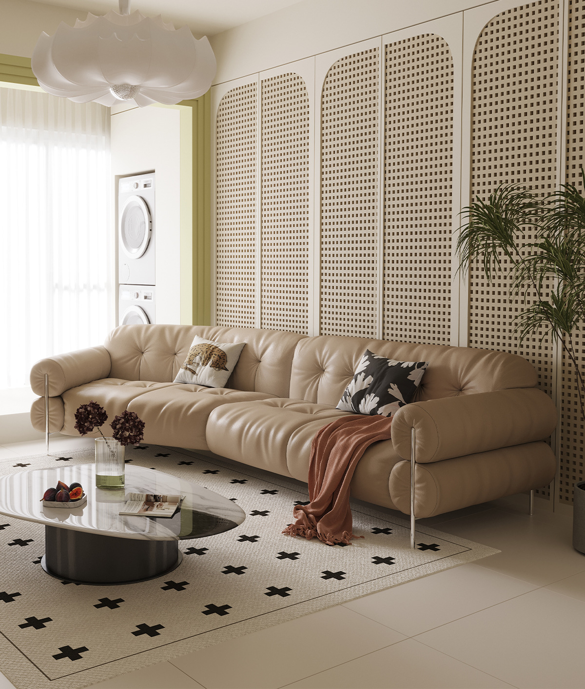 Thiết kế đơn giản nhưng tinh tế, sang trọng: Sofa da Rudai sang trọng S268 chủ yếu sử dụng những mặt phẳng trơn cong mềm mại, tạo nên vẻ đơn giản và tinh tế. Điều này tạo nên ấn tượng đặc biệt, không cần những chi tiết phức tạp. Vai ghế được thiết kế cao bo tròn, đường may đều đặn tạo nên sự chắc chắn và chỉn chu.