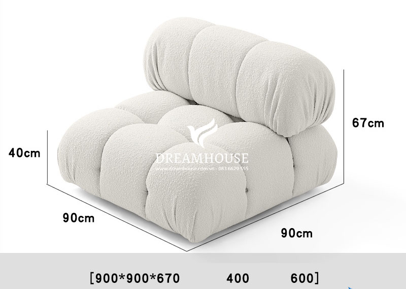 Với kích thước và thiết kế linh hoạt, Sofa vải Boucle có thể tích hợp hoàn hảo vào mọi không gian sống – từ phòng khách đến phòng ngủ, tạo nên một điểm nhấn độc đáo và thuận lợi cho các không gian nhỏ.