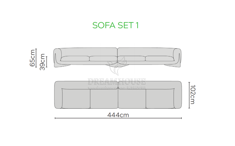 Sofa lớn: 444cm x rộng 95cm x cao 65cm