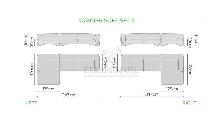 Sofa Corna: 347cm x rộng 170cm x cao 65cm